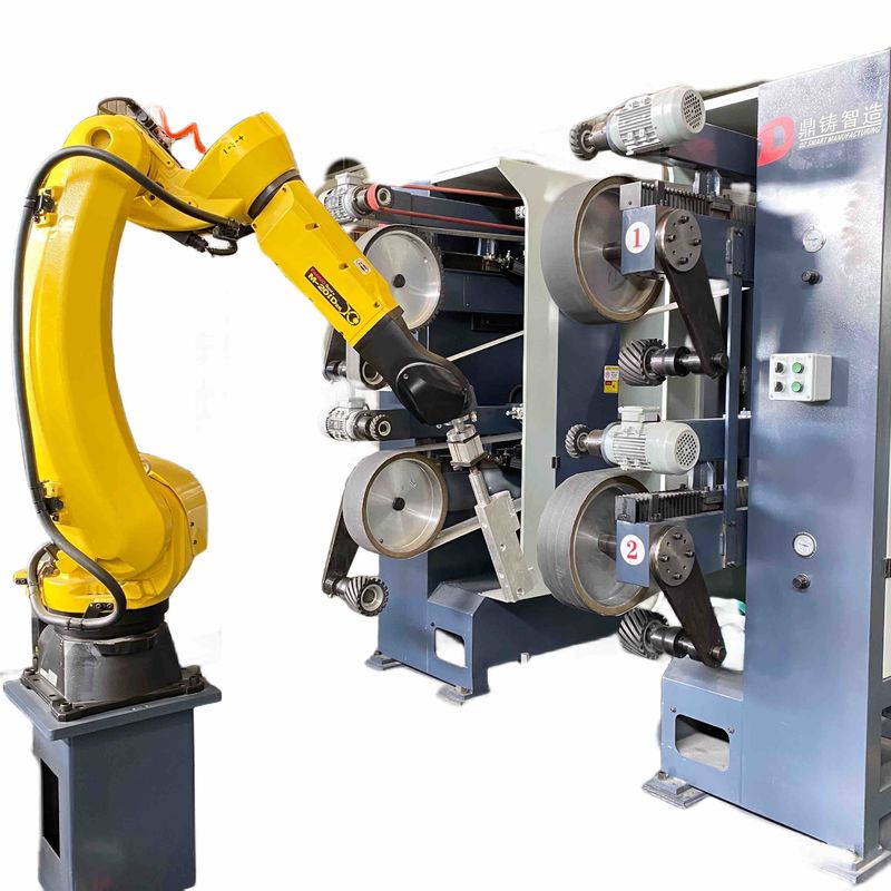 This compact polishing robotic cell is specifically designed for automated grinding and polishing of faucet bodies, featuring advanced robotic control and multiple grinding stations for efficient surface finishing.